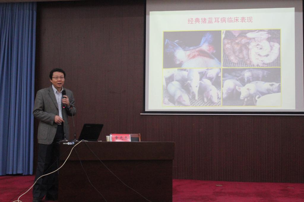 童光志研究员首先从蓝耳病病毒的结构讲起,讲诉了蓝耳病病毒的研究现状,蓝耳病疫苗的研究进展,着重介绍了蓝耳病的重组弱毒疫苗以及最新的双标记基因工程疫苗,并就师生关心的当前蓝耳病的流行状况及疫苗使用给予了解答。