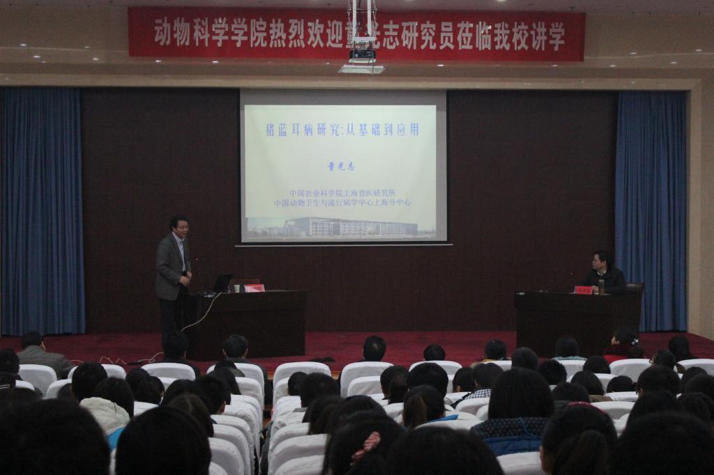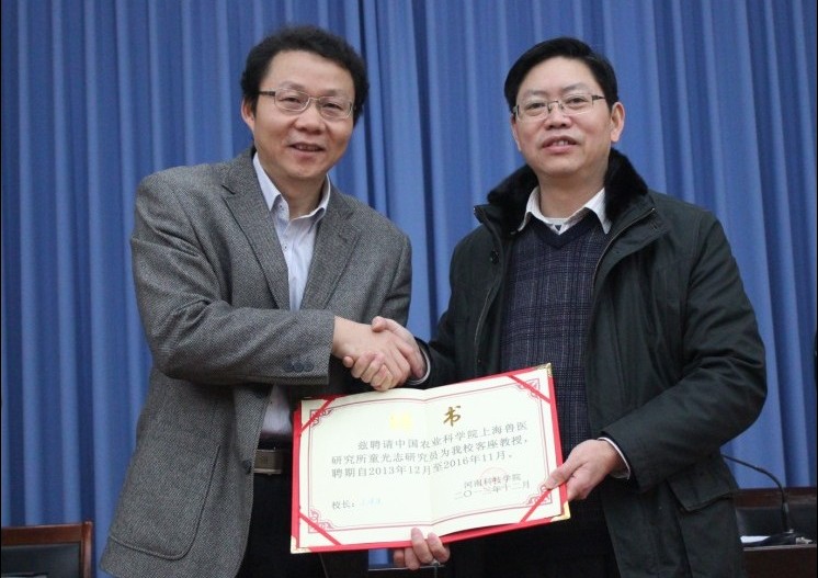 上海兽医研究所所长童光志研究员在校行政楼308会议室为我校师生做了一场题为“蓝耳病的研究——从基础到应用”的学术报告。报告会由我校副校长刘兴友主持。报告会前,副校长刘兴友为童光志研究员颁发了聘书,聘请童光志研究员为我校客座教授。