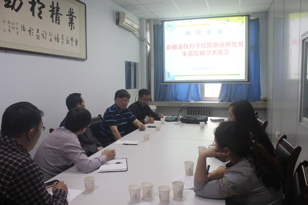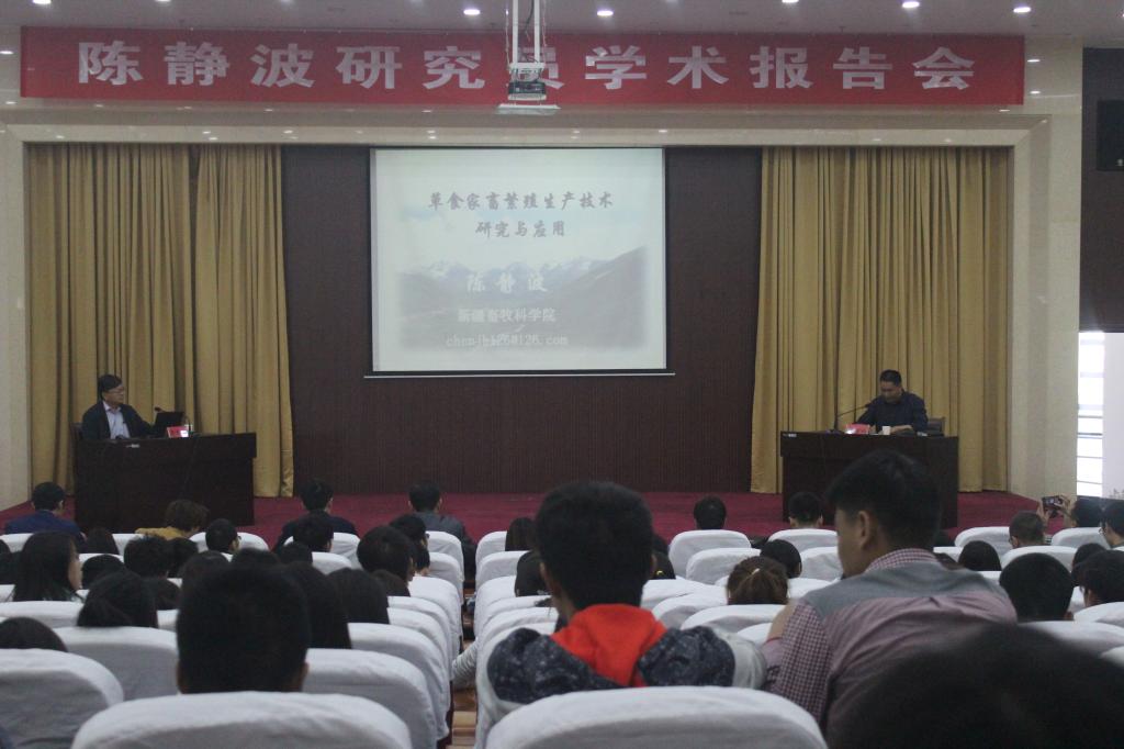 报告会上,陈研究员结合大量图片重点介绍了草食动物人工授精、同期发情、超数排卵、胚胎移植和动物克隆等动物繁殖技术的操作要点、技术难点和推广应用工作。陈研究员指出新疆维吾尔自治区作为我国草食动物主要产区,开展动物繁殖技术的引进、推广示范具有广阔的市场前景,对于提高牧民和企业经济效益具有重要作用。会前,陈研究员与我院动物科学学科的部分教师就学科发展、草食动物繁殖和牧草生产方面的问题做了深入交流。