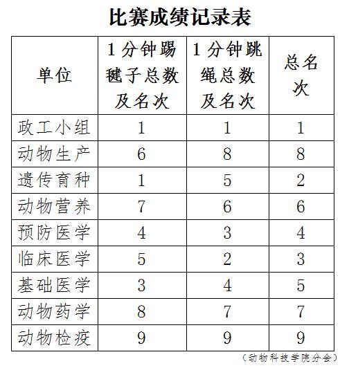通过激烈角逐,团体总分一二三名分别由政工小组、遗传育种教研室小组和临床医学教研室小组获得。踢毽子团体赛中遗传育种和政工小组并列第一名,基础医学小组获第三名。跳绳团体赛中政工小组第一名,临床医学第二名,预防医学第三名。