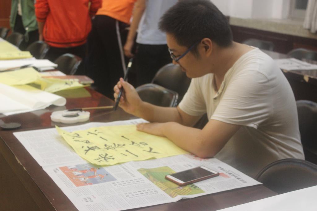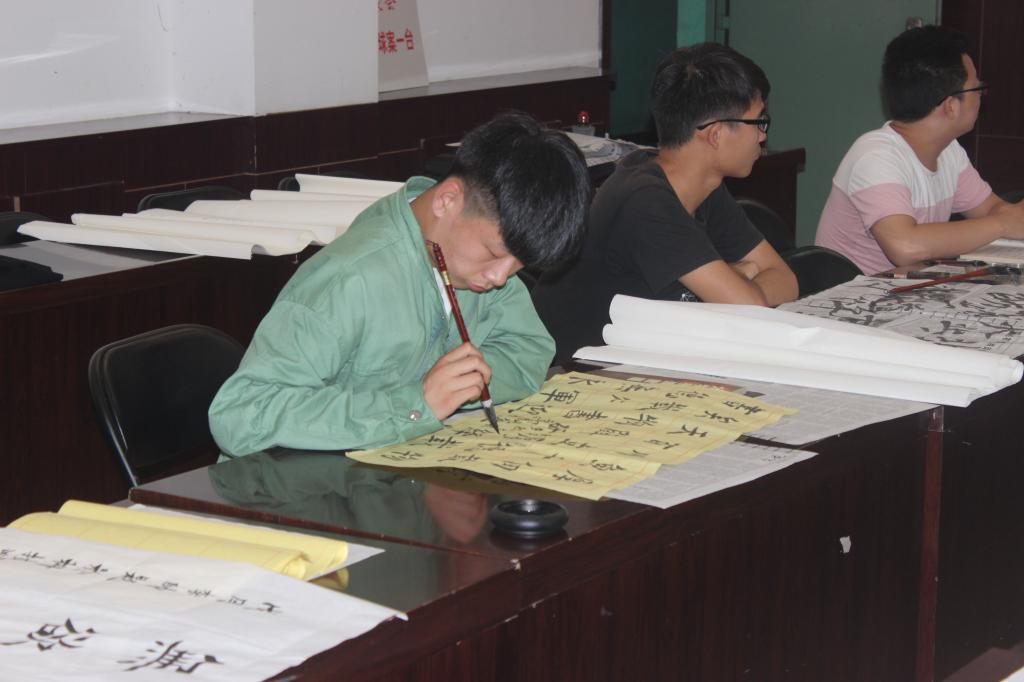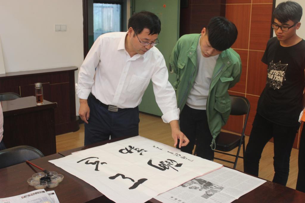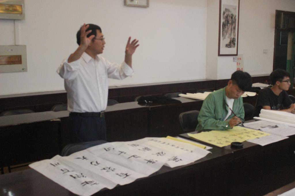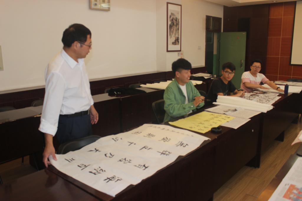 为了继承和发扬祖国的传统文化,弘扬书法艺术,丰富校园生活,我院于9月29日下午四点在E302会议室举行了以“庆祝国庆节、喜迎十九大”为主题的毛笔书法现场比赛。我院党委书记尤太生现场指导并示范。比赛结束后,尤太生书记结合本次活动主题和书法技巧传授,为大家上了一堂精彩的“书法党课”。