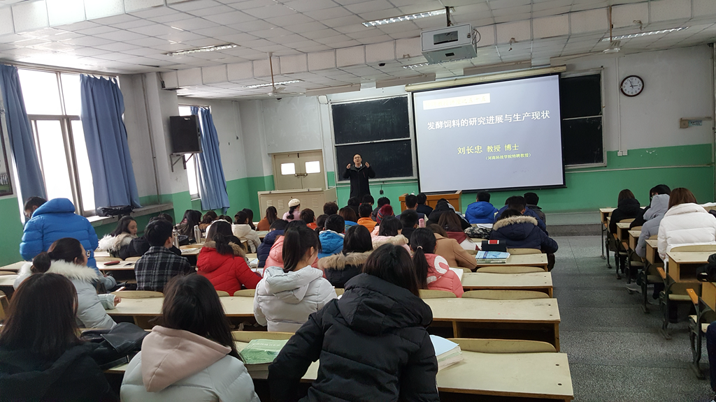 2018年1月4日下午,我校特聘教授刘长忠博士在二号楼合四教室为我院师生作了“发酵饲料的研究进展与生产现状”的专题报告,我院师生一百余人聆听了报告。