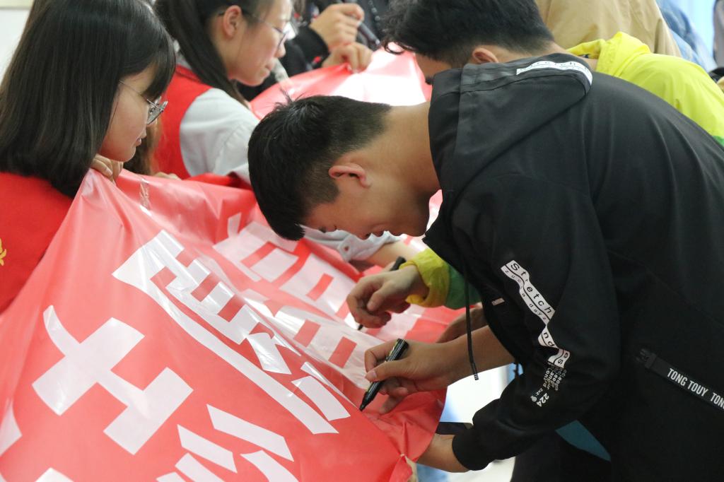分团委副书记肖震向大家讲述了他去年参加关爱留守儿童的经历,表达了自己对志愿服务组织建设的看法与建议,同时希望新生志愿者能积极参加志愿活动。随后,冯广垚带领全体志愿者面对志愿者旗帜庄严宣誓:“我愿意成为一名光荣的志愿者。我承诺:尽己所能,不计报酬,帮助他人,服务社会,践行志愿精神,传播先进文化,为建设团结互助、平等友爱、共同前进的美好社会贡献力量。”嘹亮的誓言,表达对未来的期许和庄重承诺。伴随着《青年志愿者之歌》的歌声,志愿者们依次上台在横幅上签下了自己的名字。