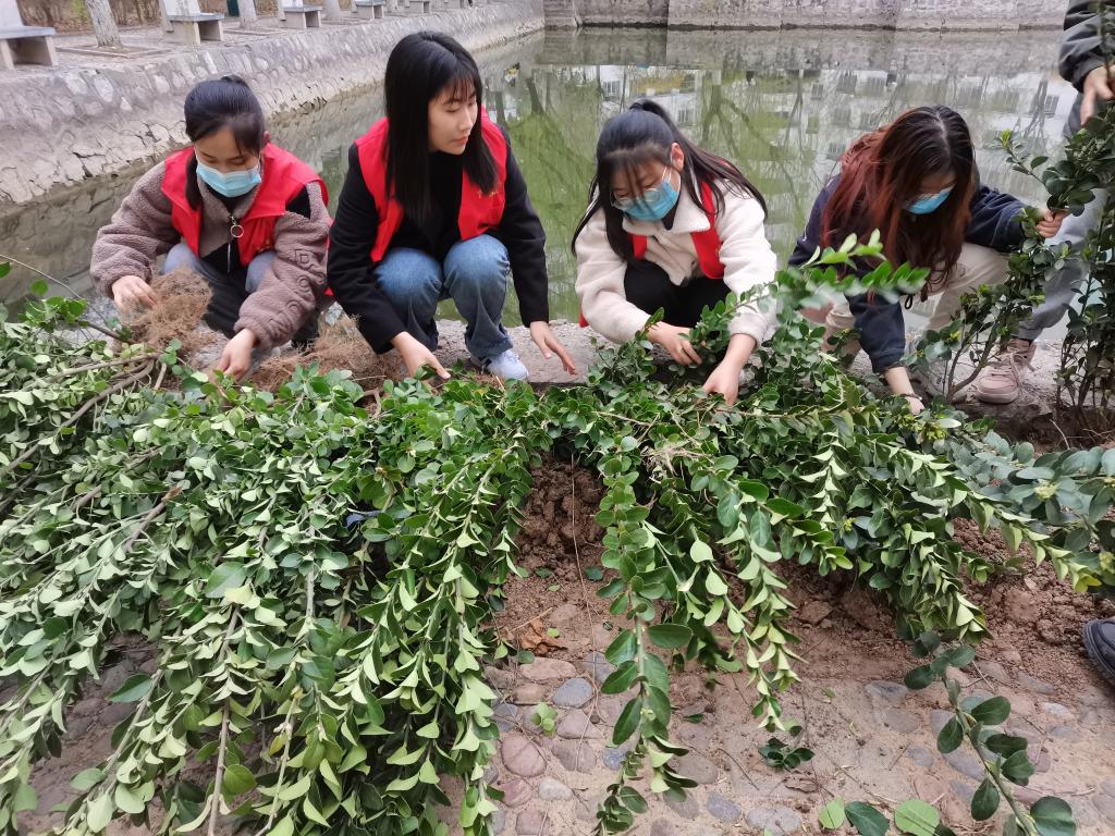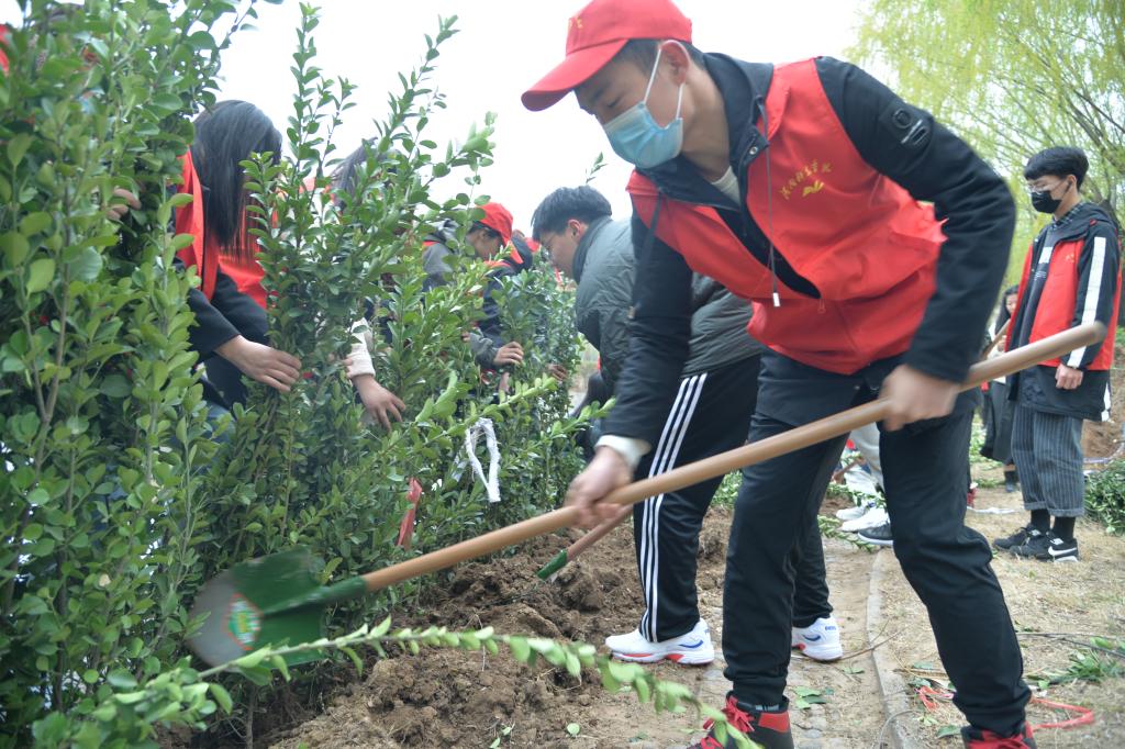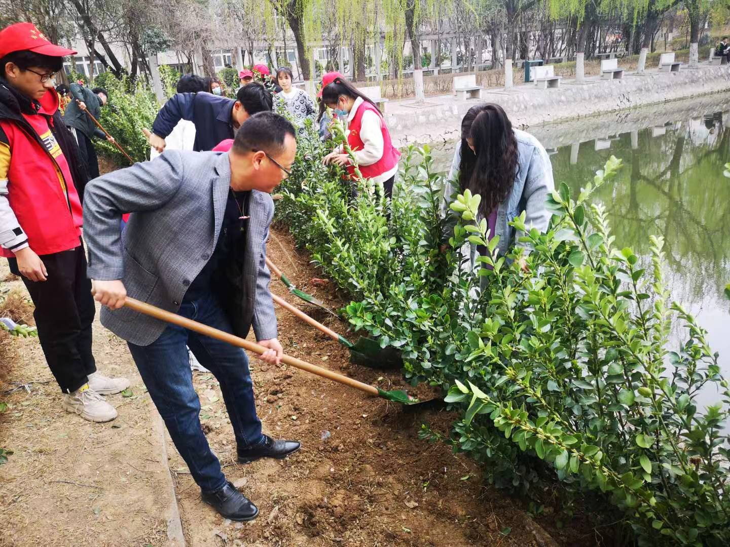 在学校西湖水畔举行“青春心向党 志愿新征程”雷锋月志愿服务主题系列活动——“建绿色校园,树绿色理想”校园植树。团委书记张书响,副书记刘璐、张帅鹏和60余名学生志愿者参加。