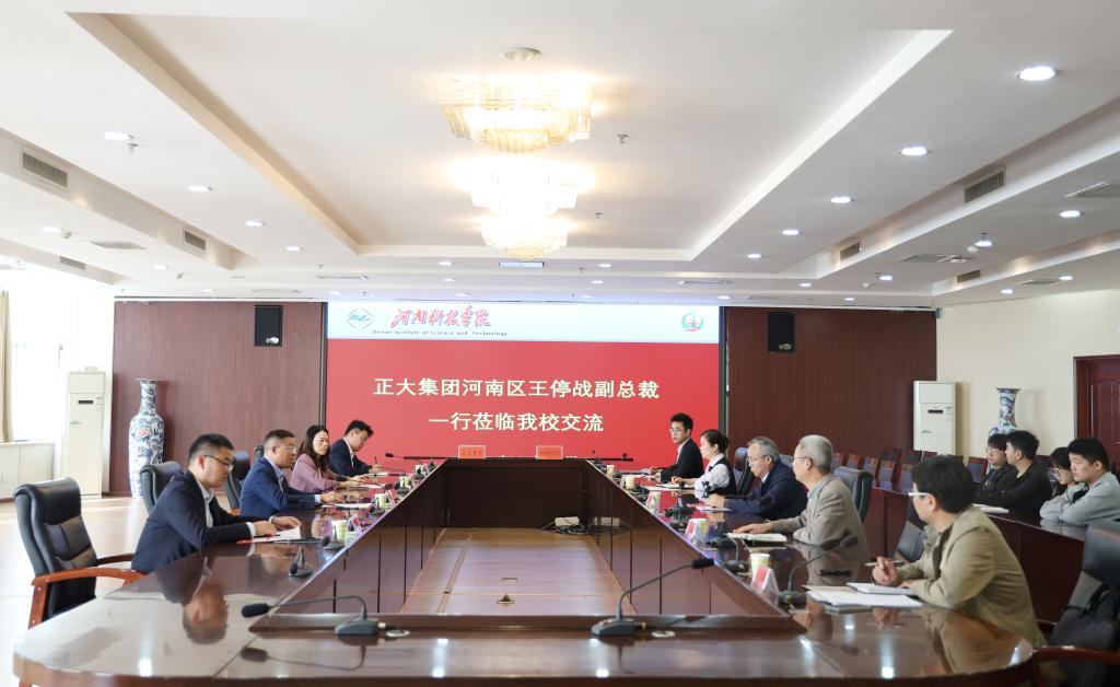 与正大集团河南区产学研战略合作推进会在行政楼206举行。正大集团河南区饲料事业副总裁王停战、河南区人力资源总监霍春阳、开封正大有限公司总经理张金生、河南区饲料事业人力主管陈柏希,河南科技太阳城线上