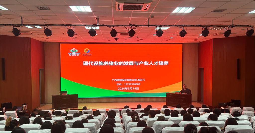 为进一步推进智慧牧业建设,推动畜牧产业高质量发展,加快专业及学科建设,3月14日下午,广西扬翔股份有限公司党委书记、副总裁高远飞应邀赴我院学术交流,院党委书记胡付广,副院长贺永惠、徐彦召,研究生秘书孙华润及在读本科生及研究生参加会议,会议在新图书馆一楼报告厅举行,由胡付广主持。