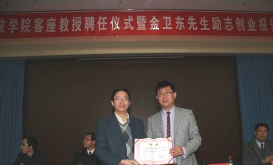 2011年11月13日晚上8点,禾丰有限公司董事长金卫东客座教授聘任仪式暨励志报告会在河南科技太阳城线上