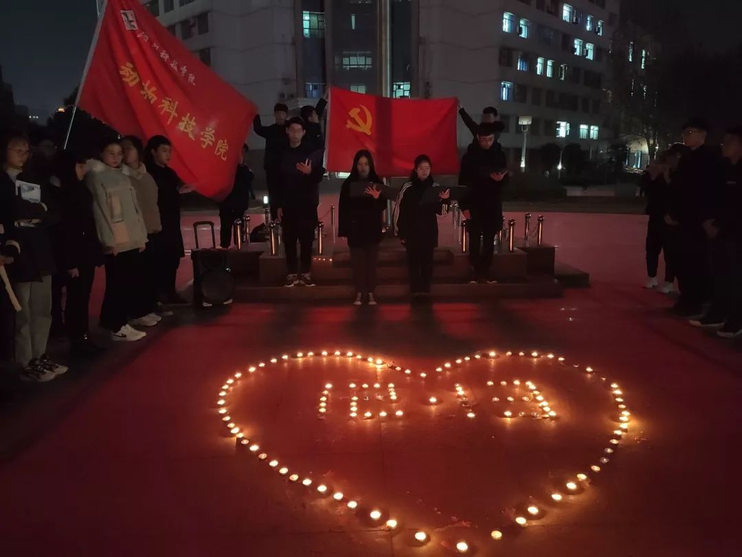 在致远广场举办“以史为鉴,照亮未来”为主题的“烛光祭”活动,同学们手托蜡烛,集体默哀,沉重悼念南京大屠杀死难者和所有在日本帝国主义侵华战争期间惨遭日本侵略者杀戮的死难者。活动最后,学生代表在鲜红党旗的见证下颂读《和平宣言》,以此表达动科学子对死难者的追念和对祖国的热爱、对和平的企盼。